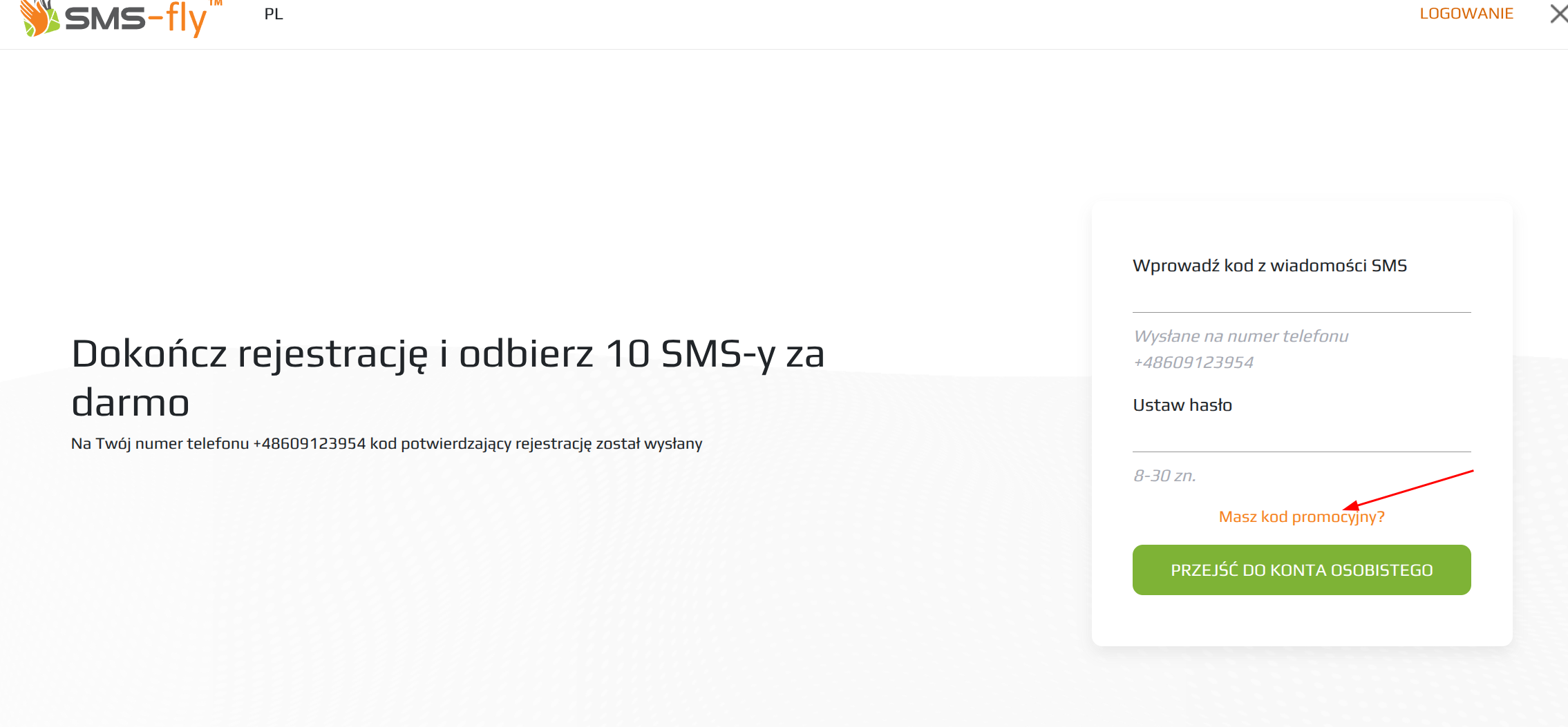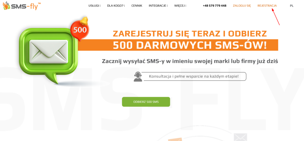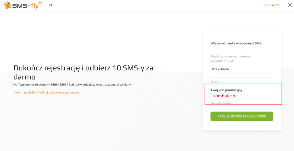 1. Zarejestruj konto SMS API (prepaid) z kodem kombotech na https://sms-fly.pl/