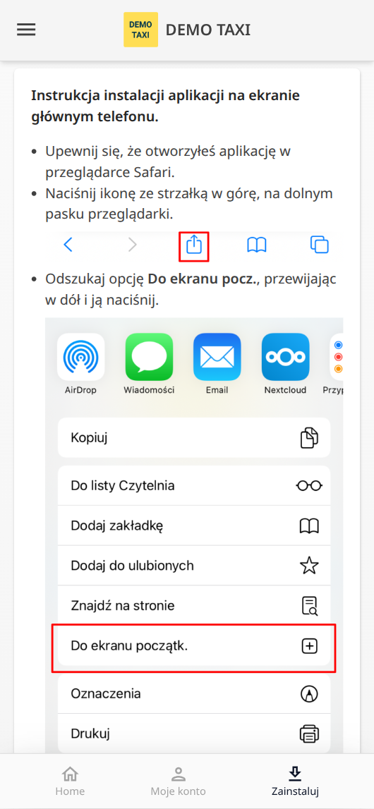 Użytkownicy iPhone/iPad mogą dodać stronę do ekranu początkowego, aby korzystać z niej jak z aplikacji. Aplikacja wyświetla zachętę i instrukcję: